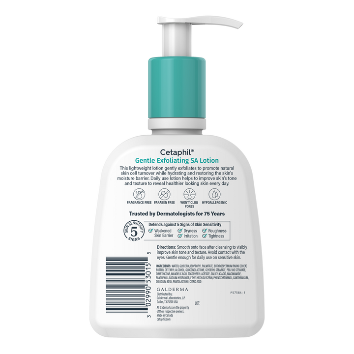 This face lotion provides 48 hour hydration while gently exfoliating. Formulated with a unique blend of Salicylic Acid, Mandelic Acid and Gluconolactone, this gentle chemical exfoliator promotes daily surface skin cell renewal for softer and smoother skin after just 1 use, without the same abrasiveness as a physical exfoliator. In fact, daily use can help improve the resilience of sensitive skin over time. Plus a blend of Niacinamide (Vitamin B3), Panthenol (Vitamin B5) and Glycerin hydrates and moisturizes skin to help restore the skin barrier. This lightweight lotion is hypoallergenic, fragrance free, paraben free and won’t clog pores, specifically developed to be gentle on sensitive skin.