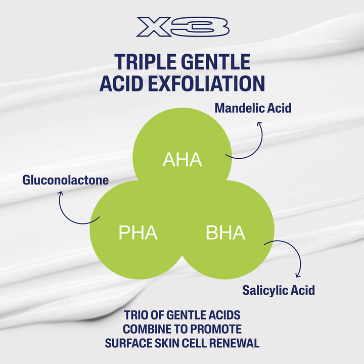 - Formulated with a unique triple acid blend of Salicylic Acid, Mandelic Acid and Gluconolactone, designed to remove excess oil, improve skin tone and retain skin's moisture while exfoliating