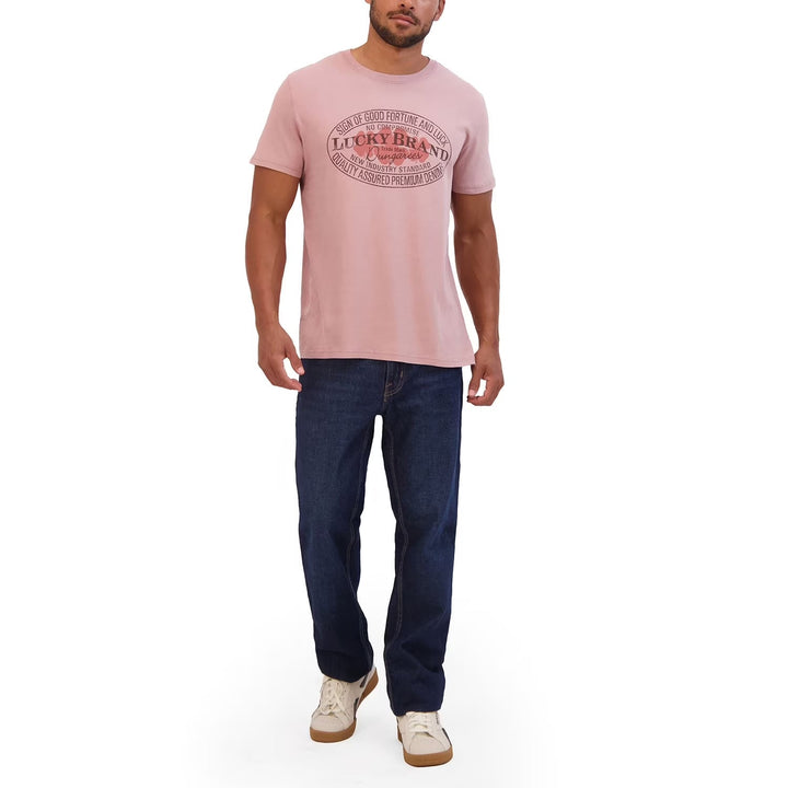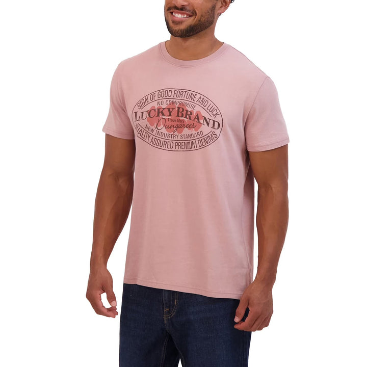 The Lucky Brand Men’s Graphic T‑Shirt | Pink is a short‑sleeve crewneck tee made from soft cotton, featuring vintage‑inspired graphics printed on a pink base. It combines everyday comfort with Lucky Brand’s signature retro Americana aesthetic.