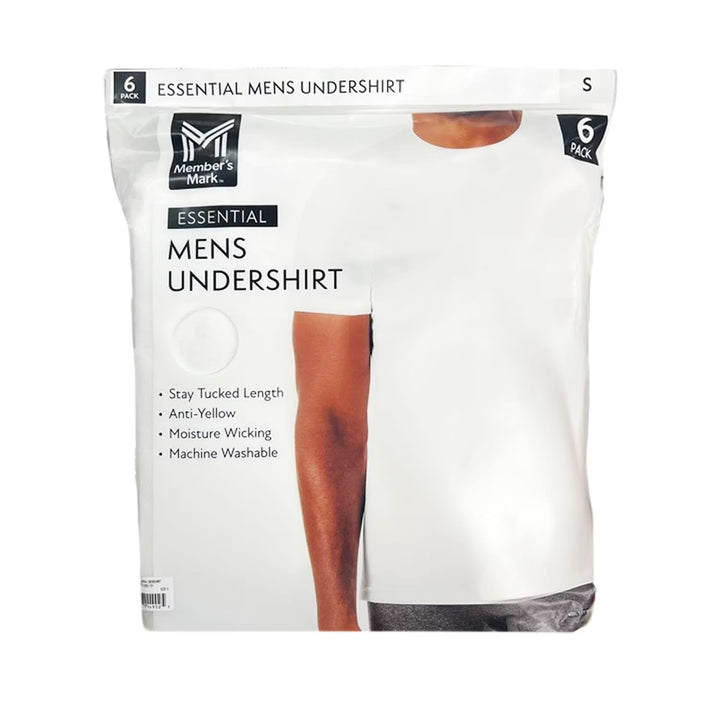 The Member’s Mark Men’s 6‑Pack Essential Undershirt | White is a value pack of six classic crewneck undershirts made from breathable cotton, designed for everyday comfort, durability, and a stay‑tucked fit.