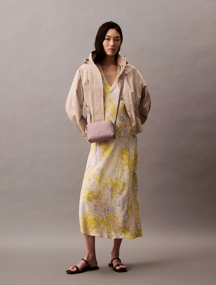 A modern camera bag with structured shaping. Adjustable at the shoulder strap for personalized wear. Finished with a metal CK monogram logo at the front.