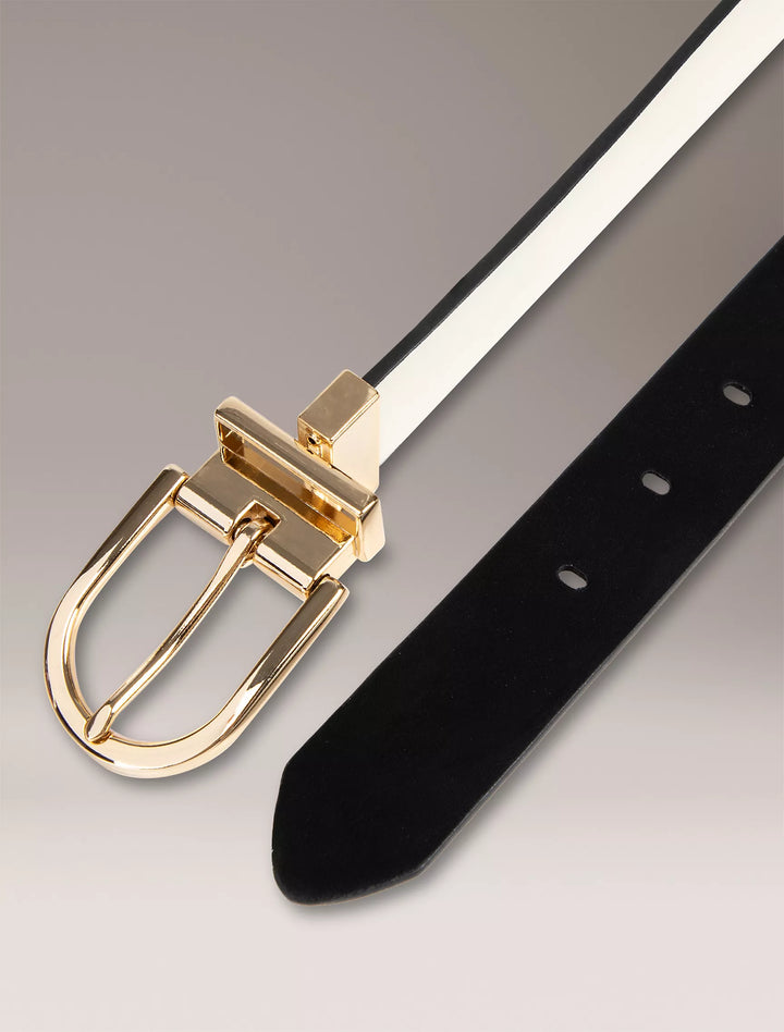 The Calvin Klein Reversible Round Buckle Belt – New Bone / Black is a sleek, dual-tone accessory that gives you two looks in one, perfect for switching between light and dark outfit pairings.