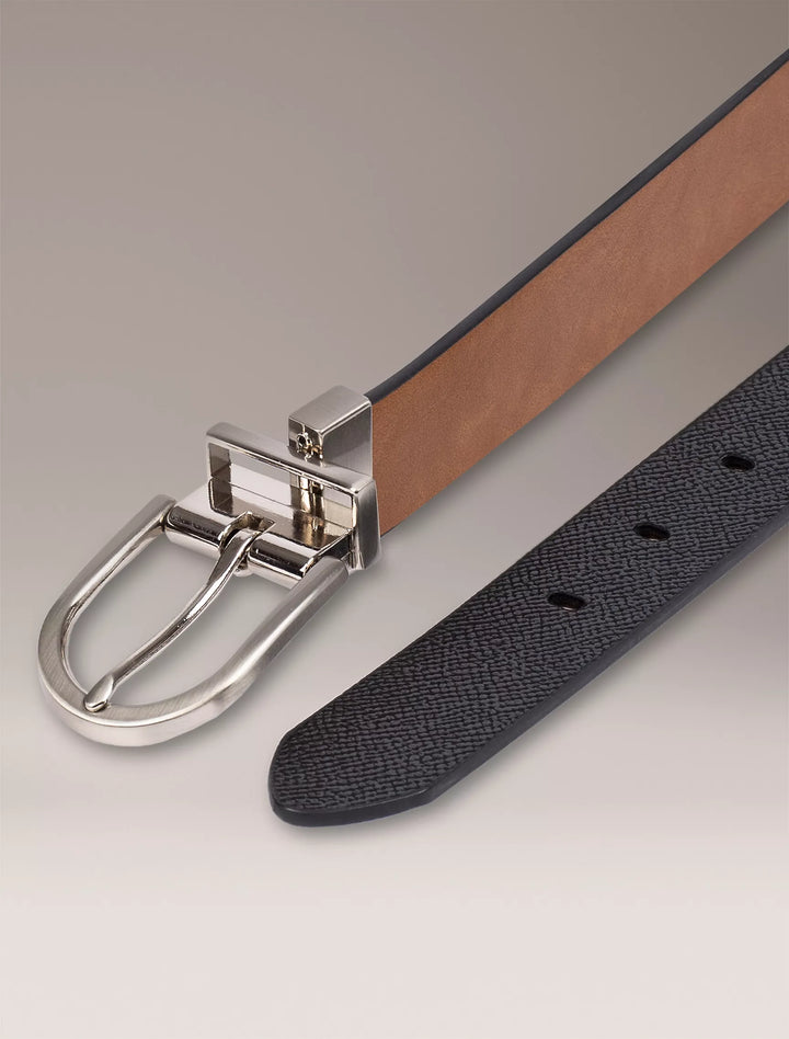 The Calvin Klein Reversible Round Buckle Belt – Saddle/Black is a versatile, two-tone accessory designed to give you two looks in one, with a clean, modern finish.