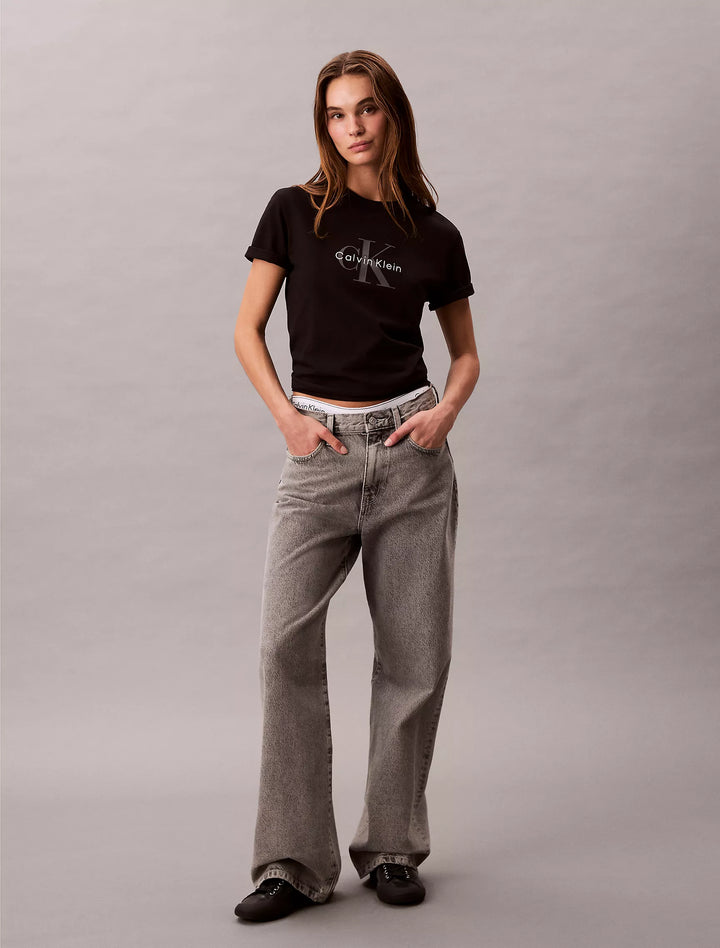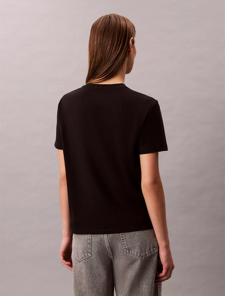 The Calvin Klein Women Monogram Logo Tee – Black is a minimalist, everyday T‑shirt featuring Calvin Klein’s iconic monogram logo, designed for comfort, versatility, and timeless style.