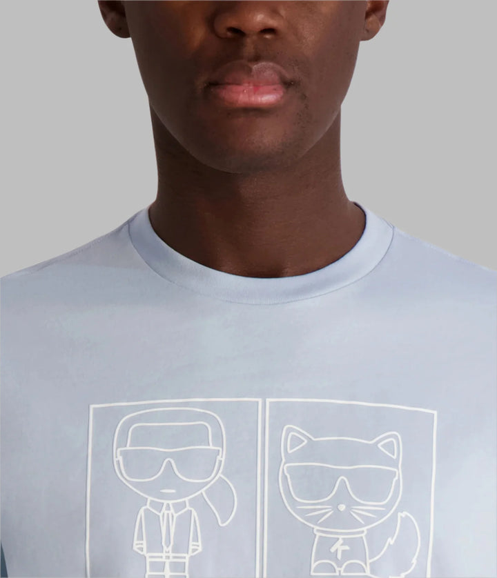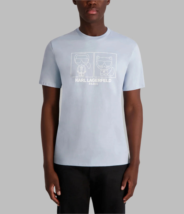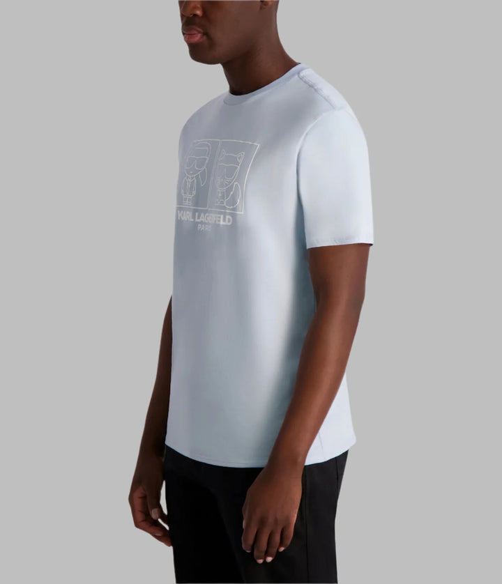 Design: Light blue short‑sleeve crewneck with a Karl & Choupette emoji‑style graphic on the chest, adding a fun, whimsical twist to the brand’s sleek aesthetic.