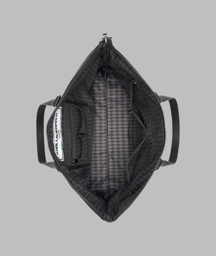 The Karl Lagerfeld Paris Karl & Choupette Travel Tote | Black is a stylish, functional travel tote featuring Karl Lagerfeld’s iconic silhouette alongside his beloved cat, Choupette. It’s designed as a roomy, durable bag for everyday use or travel, blending playful branding with practical details.