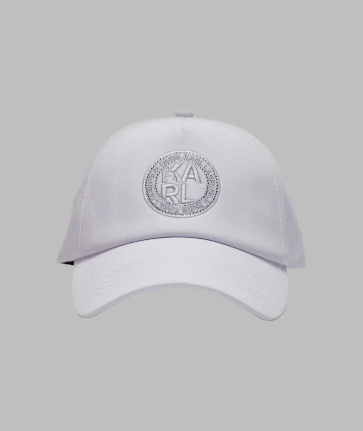 The Karl Lagerfeld Paris Krystal Karl Baseball Hat | White is a sporty‑chic cap that elevates the classic baseball silhouette with a touch of sparkle, featuring Karl Lagerfeld’s iconic branding.