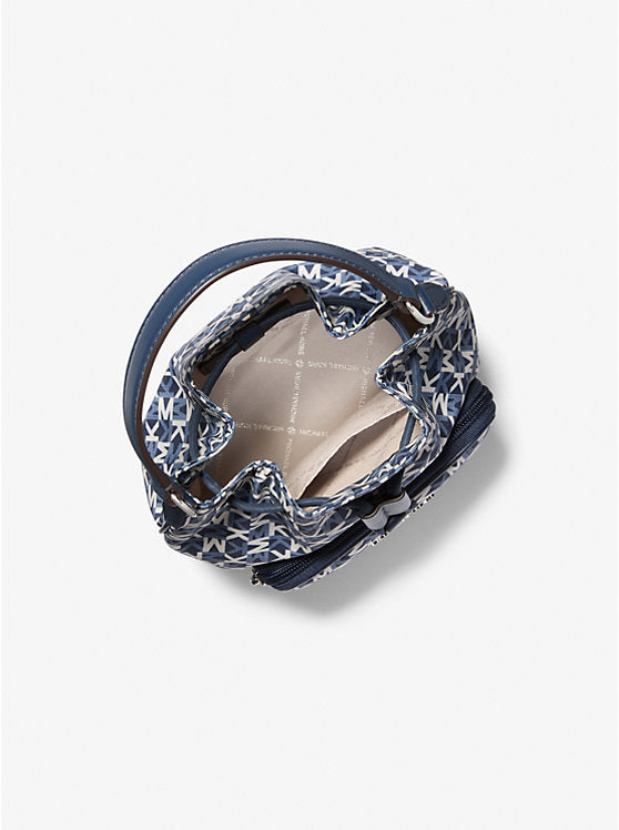 The Michael Kors Khai Small Signature Logo Bucket Bag – Navy is a compact, structured bucket bag that blends the brand’s iconic monogram print with a deep navy accent for a polished, versatile look.