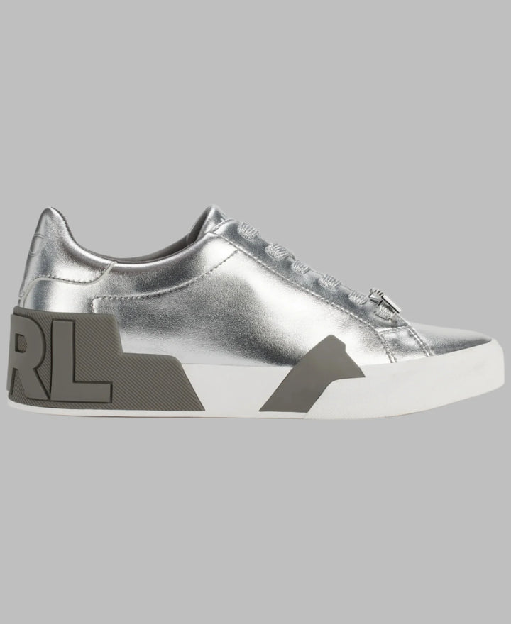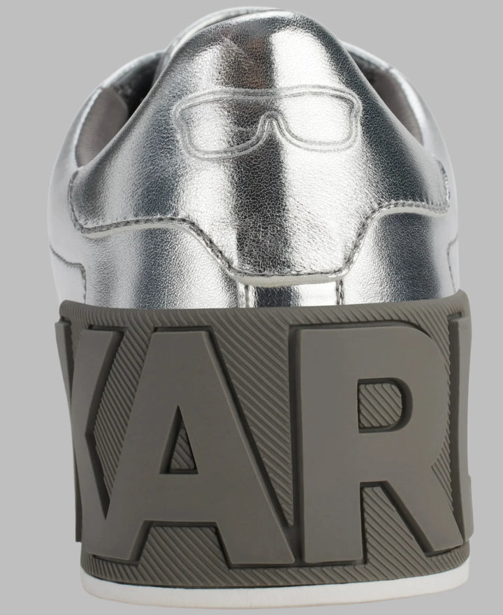 The Karl Lagerfeld Paris Melora Lace-Up Sneaker – Silver is a low-top fashion sneaker that blends sporty comfort with a bold, metallic designer finish. It’s part of Karl Lagerfeld Paris’s casual-luxe footwear line, designed to stand out while staying versatile enough for everyday wear.