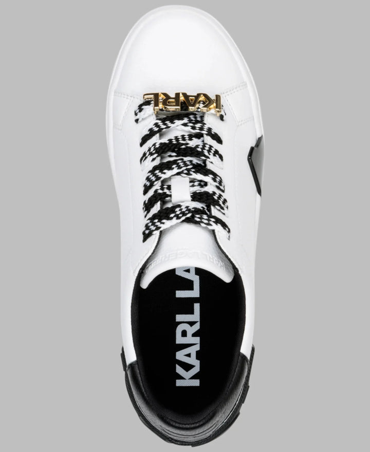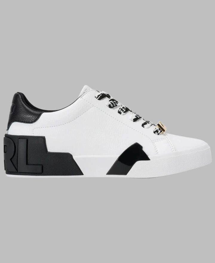 The Karl Lagerfeld Paris Melora Lace-Up Sneaker – White is a sleek, low-top fashion sneaker that mixes sporty comfort with the brand’s signature designer detailing. It’s a versatile everyday shoe that can easily be dressed up or down.
