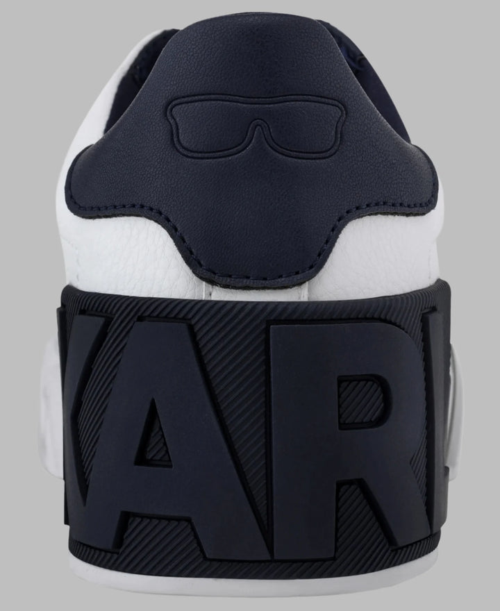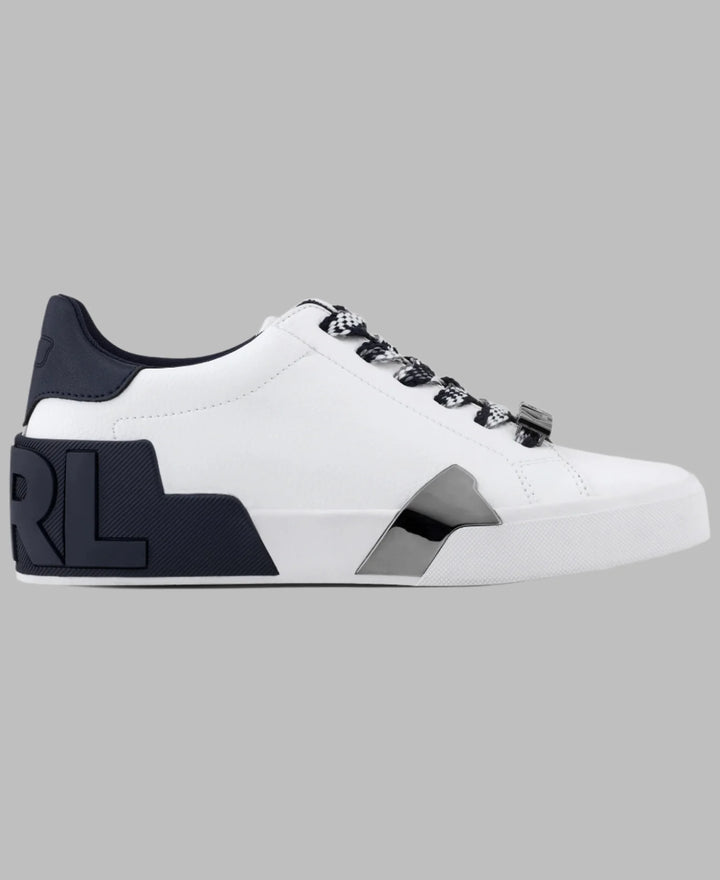 The Karl Lagerfeld Paris Melora Lace-Up Sneaker – White/Navy is a sleek low-top sneaker that combines clean, minimalist design with subtle designer detailing, making it a versatile choice for both casual and smart-casual looks.