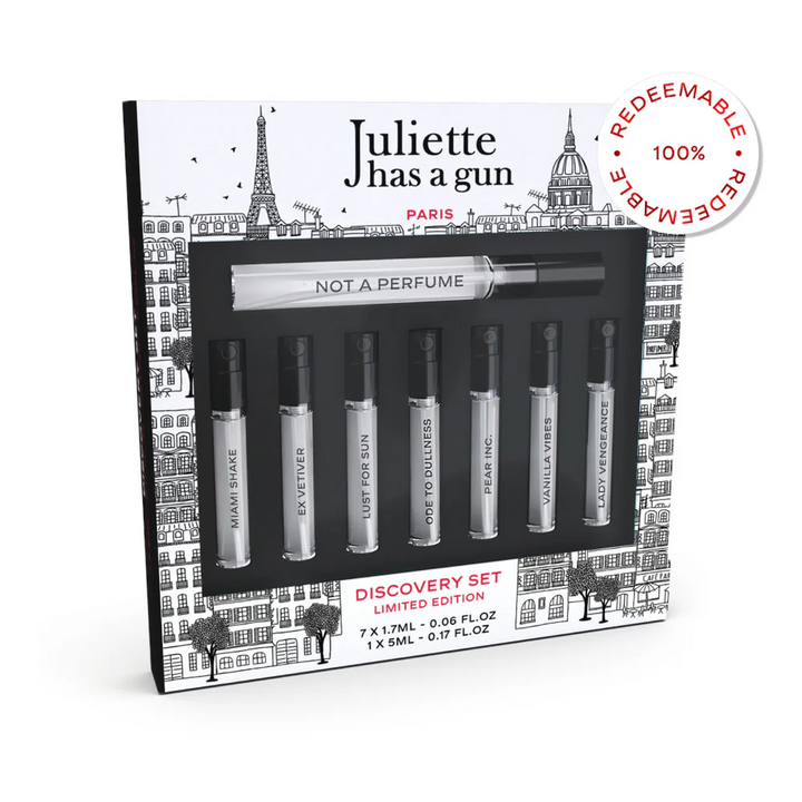 The Juliette Has A Gun Discovery Set – Miami Shake is a limited‑edition fragrance sampler that highlights the brand’s newest scent, Miami Shake, alongside several of its bestsellers, plus a deluxe mini of their cult classic Not a Perfume. It also comes with a voucher you can redeem toward a full‑size bottle.