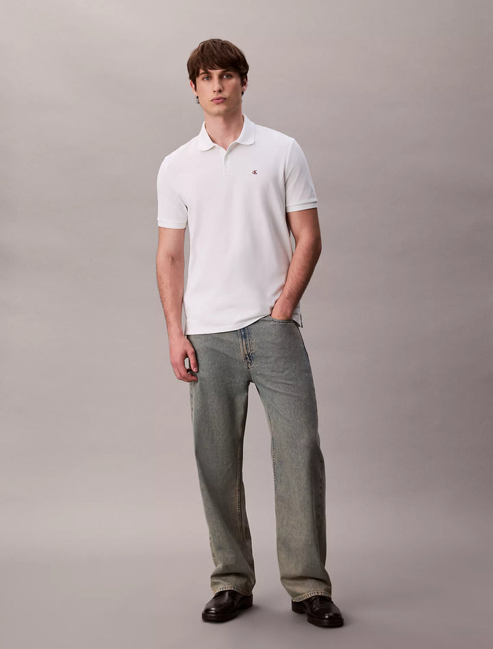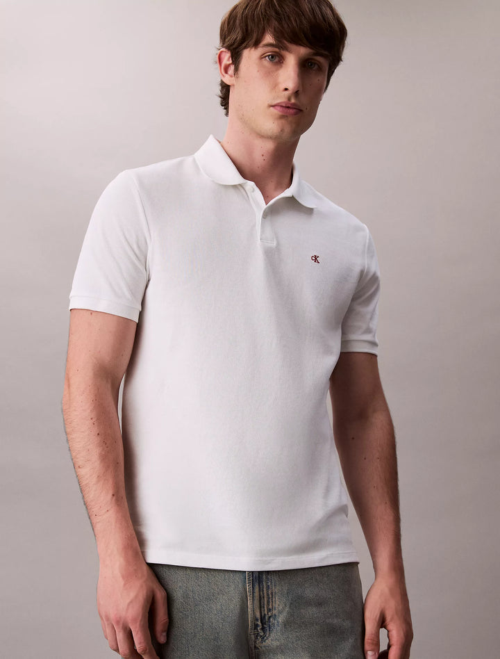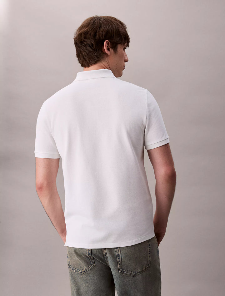 The Calvin Klein Cotton Pique Classic Polo Shirt in Blanc De Blanc is a men’s short-sleeve polo made from 100% cotton with a piqué knit, styled in a crisp, clean white shade. It’s a timeless, breathable, and versatile piece designed for everyday wear.