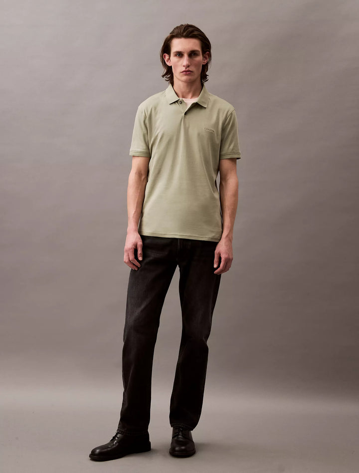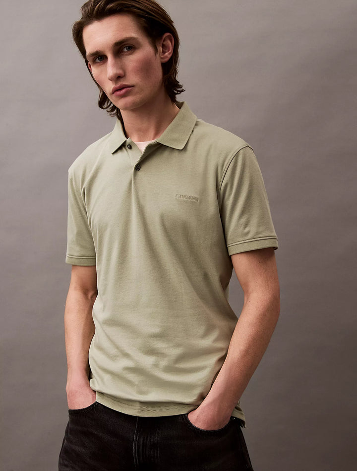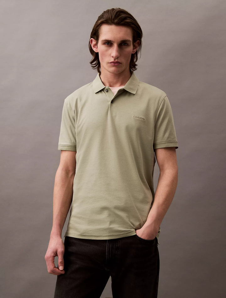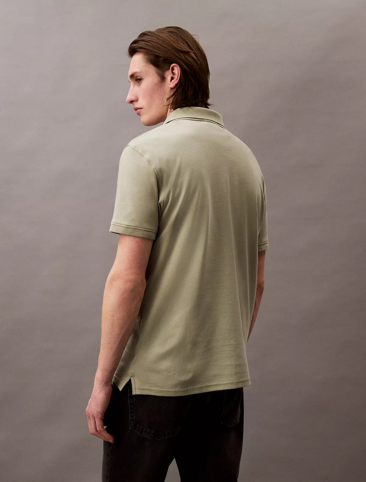 The Calvin Klein Liquid Touch Polo Shirt in Tea is a men’s short-sleeve polo crafted from Liquid Touch cotton, a premium fabric designed to feel supremely soft, lightweight, and cool against the skin. The color Tea is a muted, earthy greenish-beige tone—subtle and versatile for both casual and smart-casual outfits.