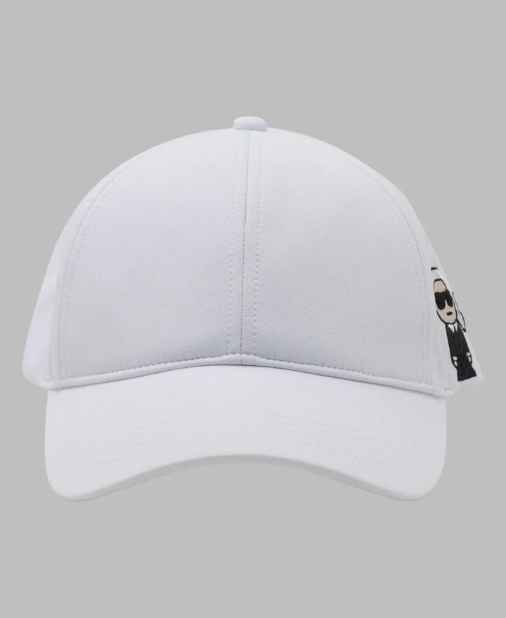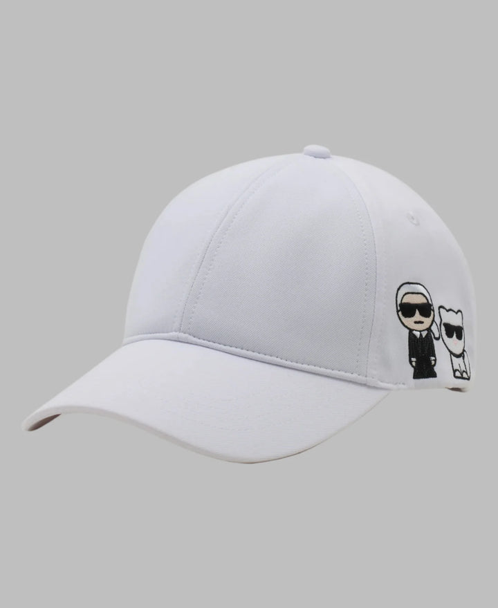The Karl Lagerfeld Paris Karl and Choupette Cap | White is a playful, sporty‑chic baseball cap featuring Karl Lagerfeld’s iconic silhouette alongside his beloved cat, Choupette. It’s part of the Karl Lagerfeld Paris accessories line, designed to add a fun designer twist to a casual staple.