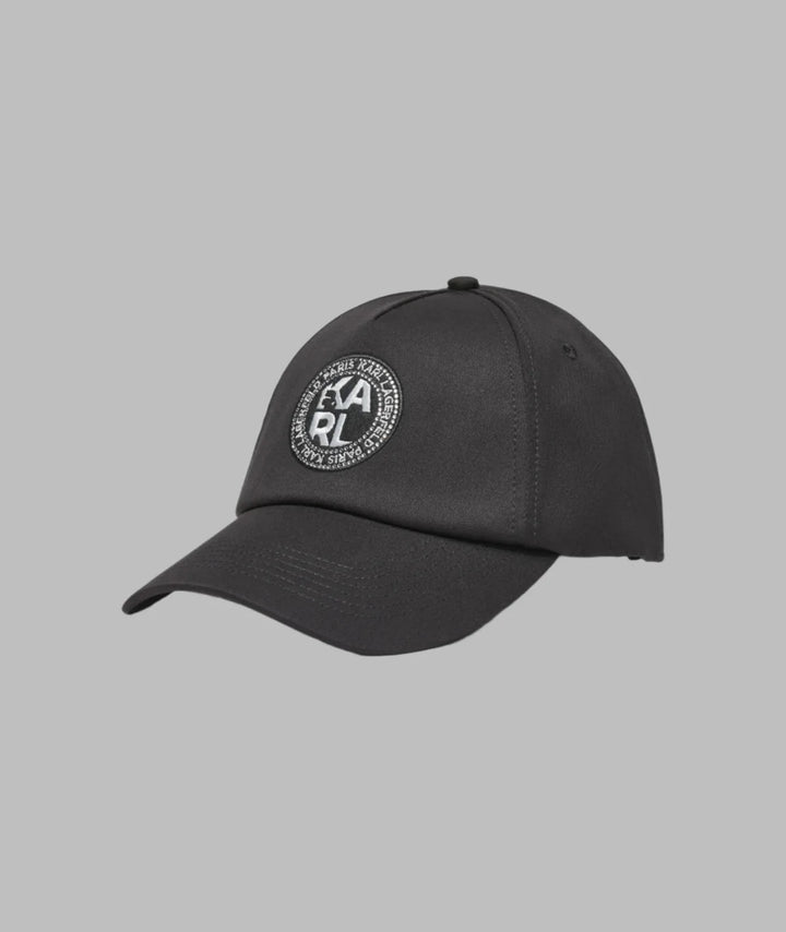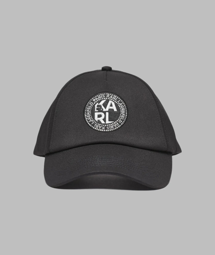 Front decorated with a round Karl Lagerfeld profile patch, accented with clear crystal embellishments for shine
