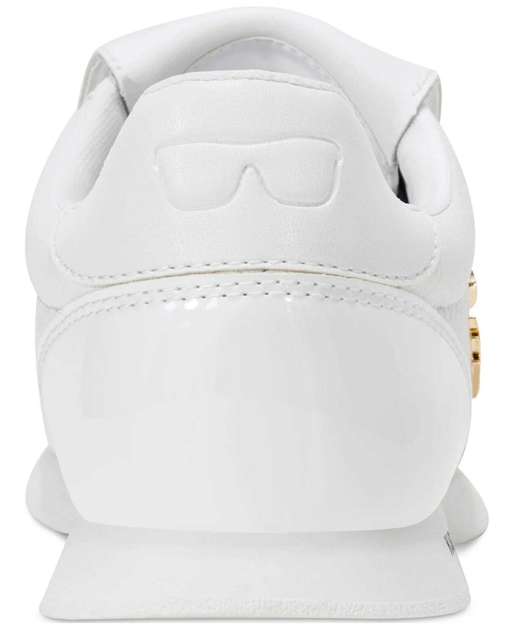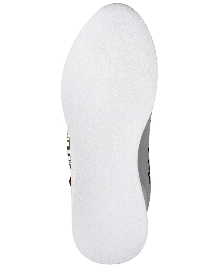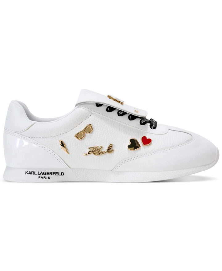 The Karl Lagerfeld Paris Minia Pins Flap Leather Sneaker | White is a statement low‑top sneaker that mixes playful Karl Lagerfeld detailing with a luxe leather build. It’s part of the Pins Collection, which features signature Karl‑themed embellishments on a foldover flap tongue.