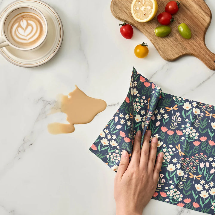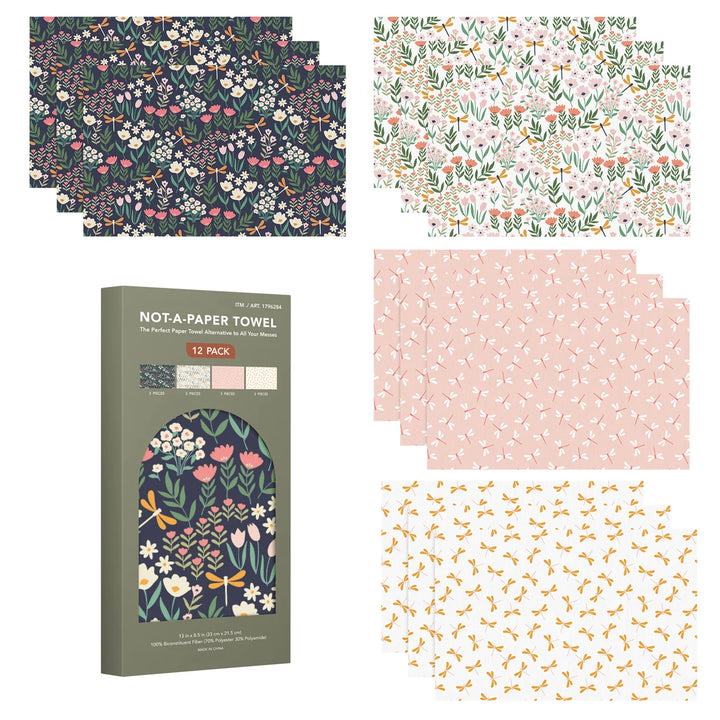 The Not‑A‑Paper Towel, 12‑pack – Dragonfly Bliss is a reusable, machine‑washable alternative to disposable paper towels, designed to handle everyday kitchen messes while reducing single‑use waste. The Dragonfly Bliss version features a coordinated set of prints inspired by dragonflies and nature motifs in soft, calming colors.