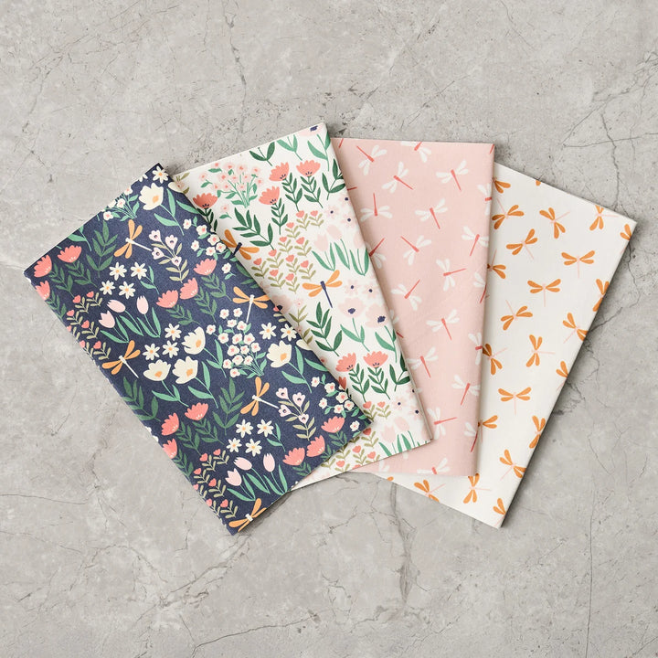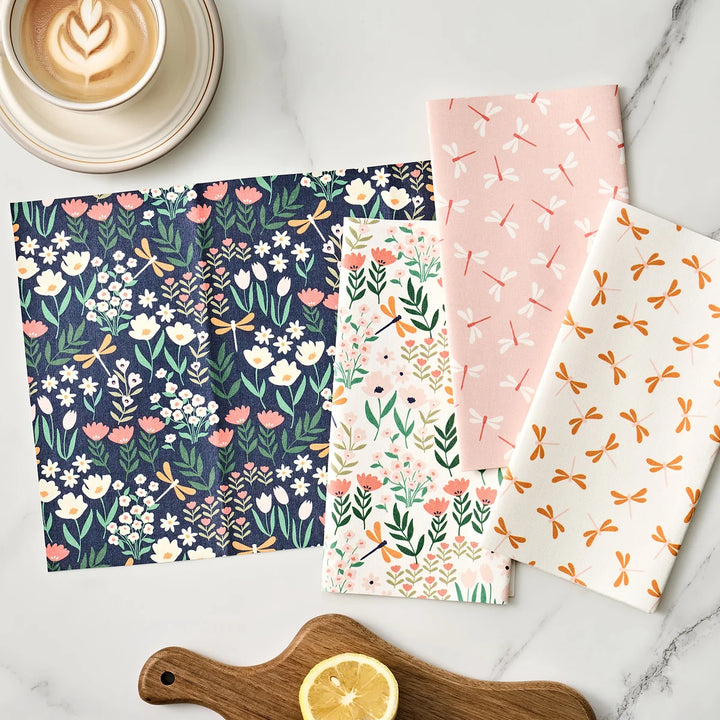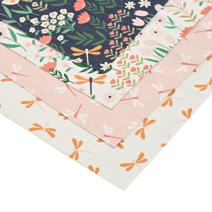 Design: Dragonfly Bliss — 4 coordinated patterns per pack, with dragonfly and botanical themes