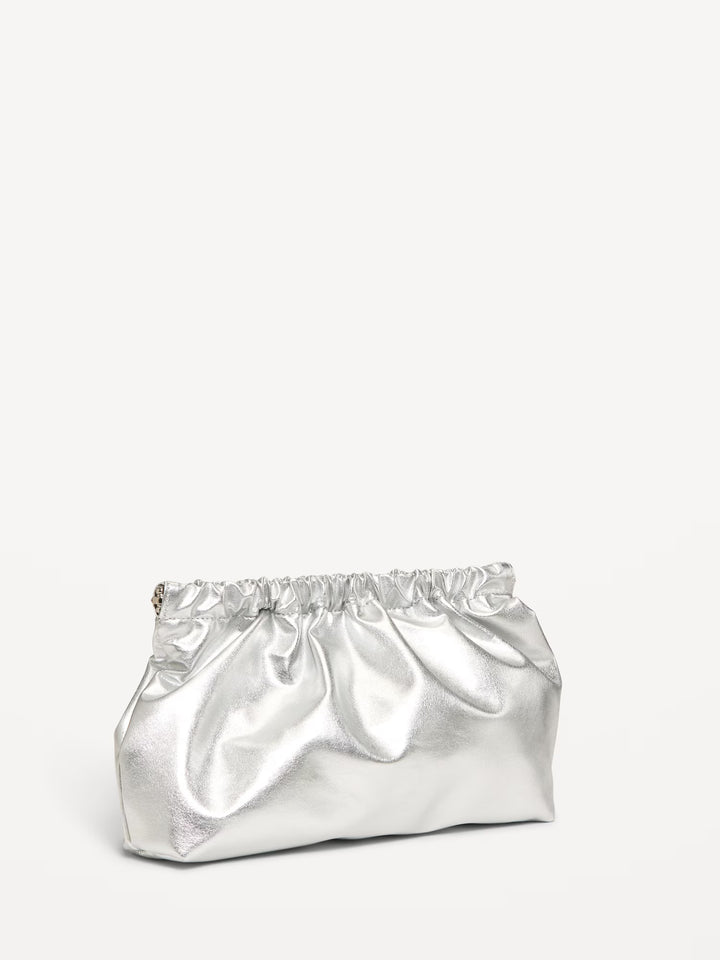 The Old Navy "The Occasion by Old Navy Gathered Clutch - Silvery Silver" is a clutch bag designed for special occasions. It features a gathered, textured design, likely made from a soft faux leather material. The clutch is part of Old Navy's "The Occasion" collection, which focuses on accessories suitable for events like parties, proms, graduations, and weddings. It comes with a thin crossbody strap that can be tucked away, allowing it to be used as both a clutch and a crossbody bag. The bag is silver in color and is designed to elevate any outfit.