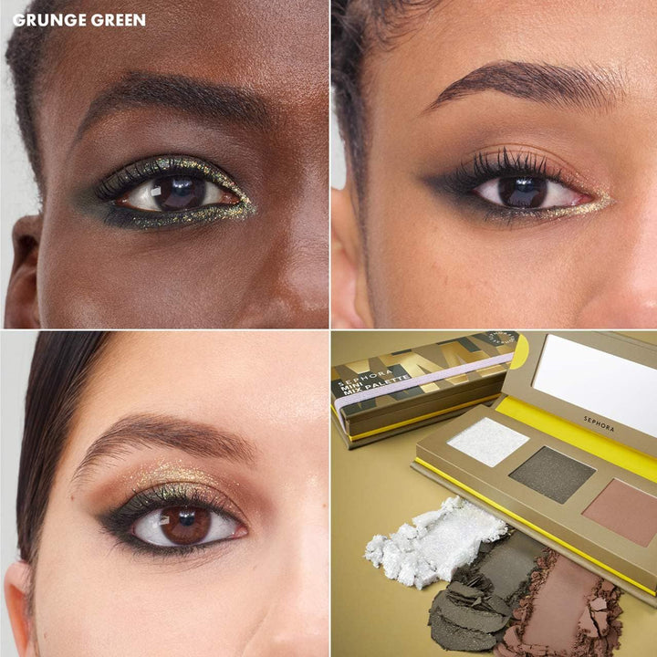 The Sephora Mini Mix Eyeshadow Palette in Grunge Green is a compact trio of earthy-toned eyeshadows designed for versatile, long-lasting looks. It features three coordinated shades in different finishes (matte, shimmer, glitter, or duochrome) that can be worn alone or blended together, and the pans are removable so they can also be slotted into a larger Sephora Mega Mix Palette.