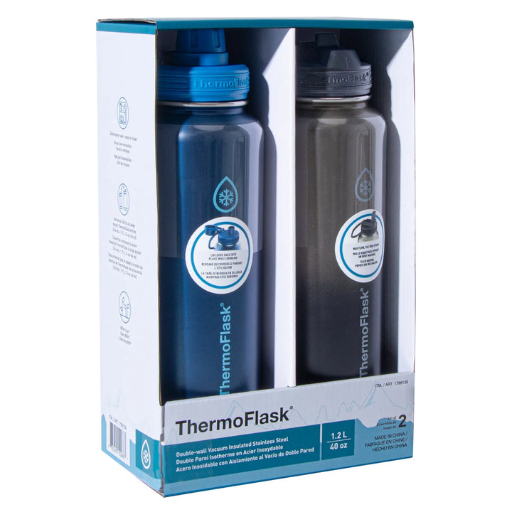 ThermoFlask 40oz. 2-pack keeps you set for everything from workouts to workdays. An essential fan-favorite, each set is perfect for hours of thirst-quenching. Plus, with both straw and spout style leak-proof lids, there's no need to choose between one or the other.